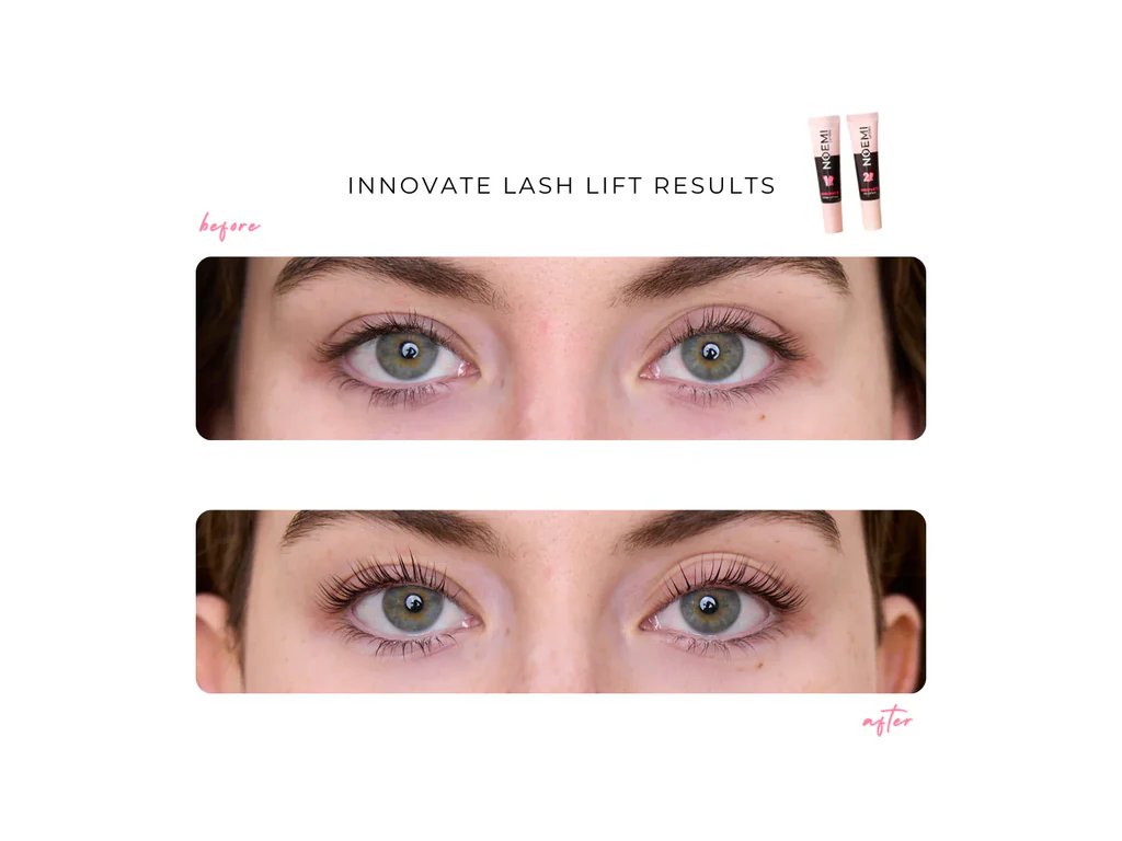 Naneste produkt jako první krok během lash liftingu nebo laminace obočí. Nechte působit 8–12 minut podle typu chloupků. Poté pokračujte dalšími kroky. Používejte pouze s Noemi Innovate Fix Lotion Step 2.