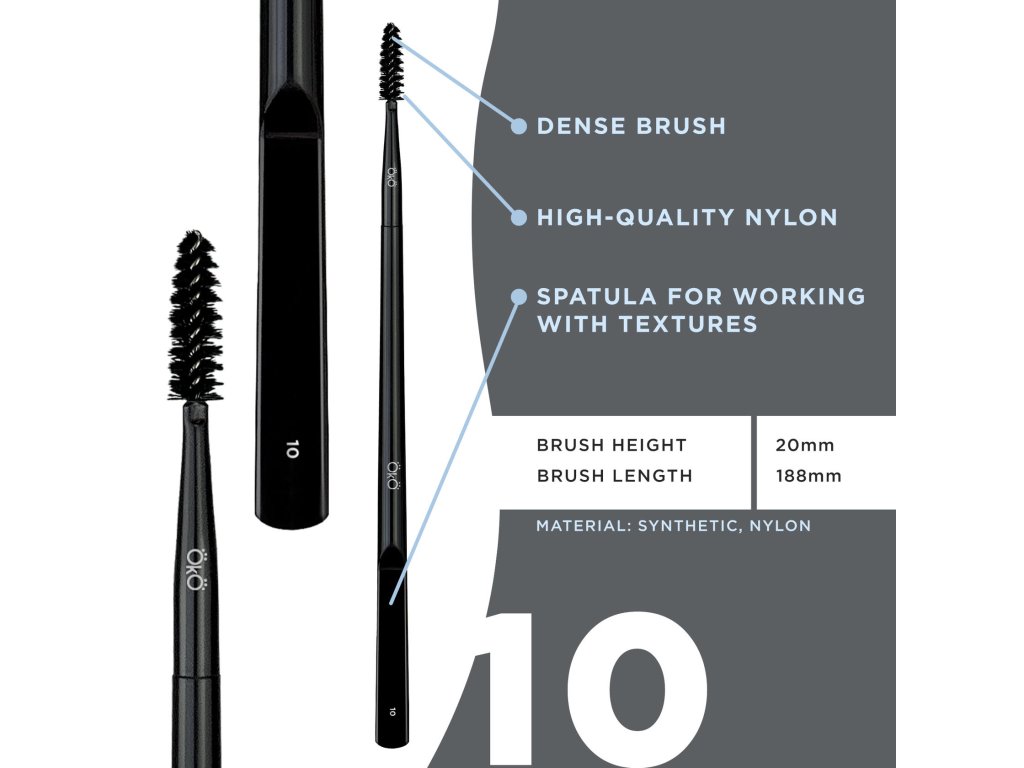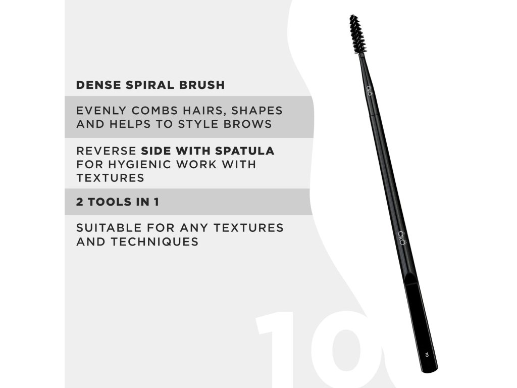 Profesionální oboustranný nástroj OKO #10 kombinuje praktickou spirálovou hlavici pro úpravu obočí a plochou špachtli pro hygienickou práci s texturami. Šetří místo, urychluje práci a zajišťuje maximální hygienu během procedur.