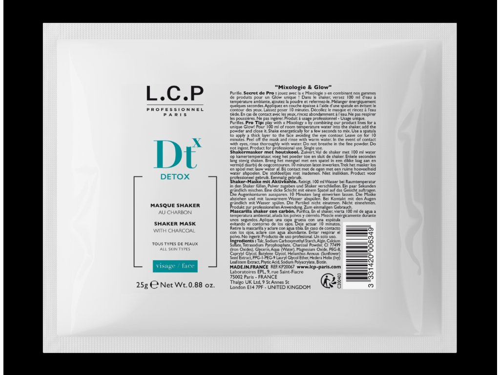 Použití: Nalijte 100 ml vody pokojové teploty do shakeru, vysypte do něj celý obsah sáčku a energicky protřepejte, dokud se maska nerozmíchá. Špachtlí aplikujte masku na obličej ve vrstvě cca 3 mm silné, vynechte oční okolí. Masku nechte působit cca 10 minut. Poté masku sloupněte a zbytky odstraňte vodou. V případě kontaktu s očima je vypláchněte vodou. Prášek nevdechujte, nepožívejte. Maska je určena pro jednorázové použití. Je určena pro profesionály.