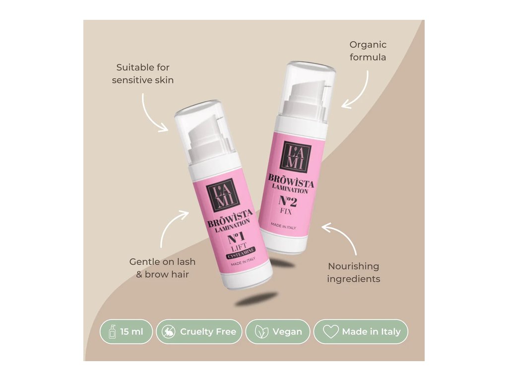 Browista Lamination System v lahvičkách od Lami Lashes je šetrná, veganská alternativa k tradičním systémům laminace. Obsahuje cysteamin a rostlinné aminokyseliny, které přetvářejí disulfidové vazby v chloupcích bez použití agresivních kyselin. Systém je vhodný pro laminaci řas i obočí a umožňuje práci bez použití lepidla.