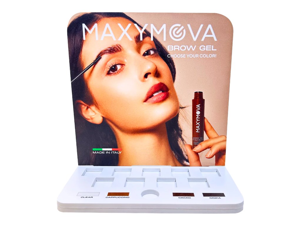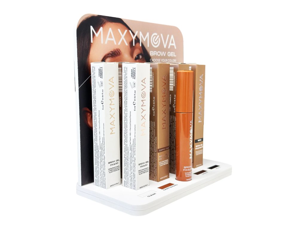 Profesionální stojan MAXYMOVA Brow Gel Display Stand je navržený pro kosmetické salony, které chtějí elegantně prezentovat a prodávat gely na obočí. Zvýšíte viditelnost produktů, zefektivníte prodej a nabídnete klientkám možnost vyzkoušet gely přímo po laminaci obočí. Předem naplněný stojan šetří váš čas a vypadá skvěle na každém kosmetickém pultu.