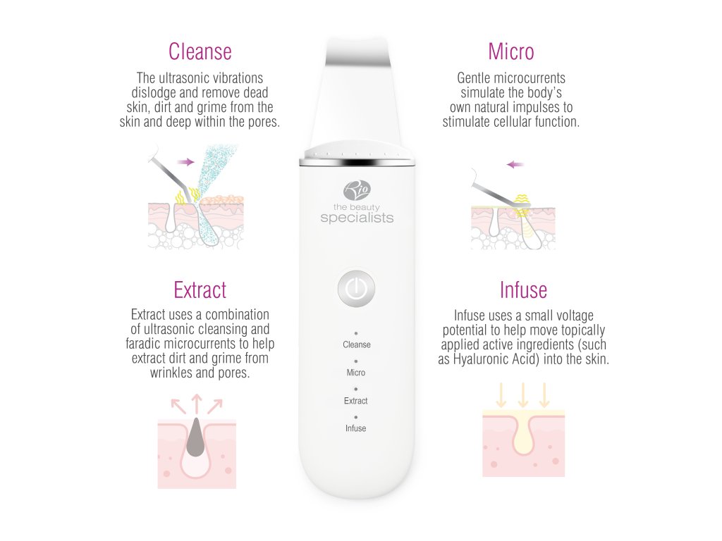 - Infuse – galvanická funkce podporuje pronikání aktivních látek (např. kyseliny hyaluronové) hlouběji do pokožky, čímž zvyšuje účinnost aplikovaných sér.